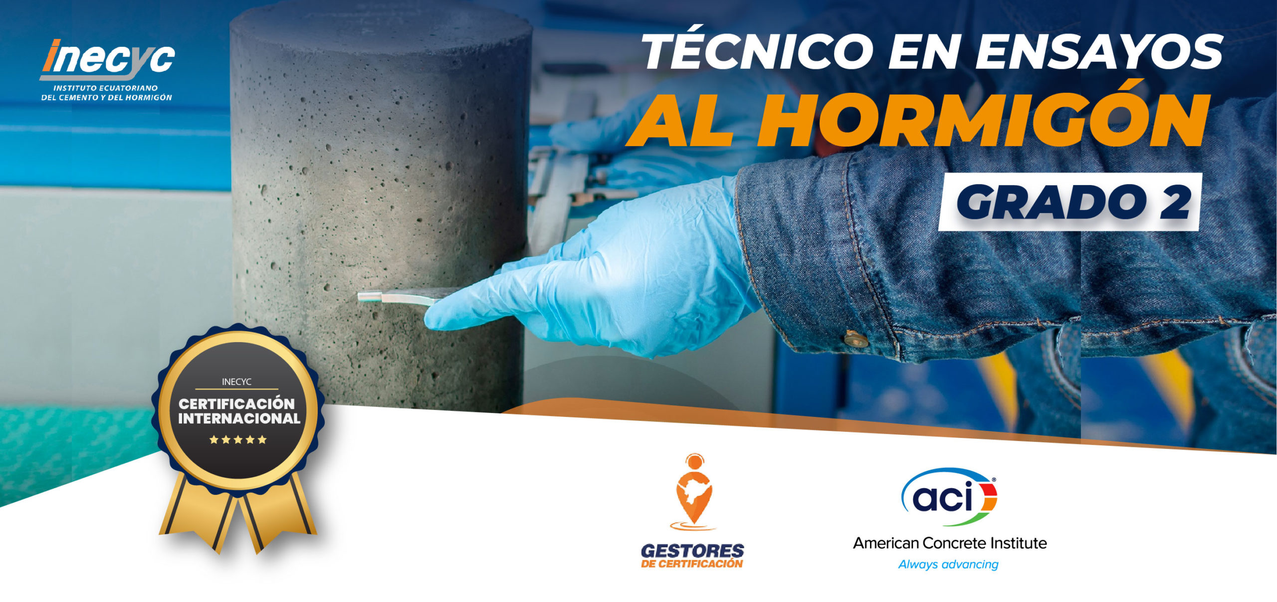 La certificación de Técnico en Ensayos al Hormigón (Grado 2), ha sido creada mediante la fusión del Técnico en Pruebas de Resistencia (ACI), Técnico en Pruebas de Agregados (ACI) e Interpretación de Resultados (INECYC), con la finalidad de que el participante adquiera el conocimiento teórico y práctico de 13 normas de Pruebas de Laboratorio de Hormigón.